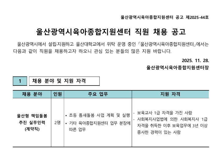 | ´ÙÀ½±Û | [ä¿ë] ¿ï»ê ºÏ±¸À°¾ÆÁ¾ÇÕÁö¿ø¼¾ÅÍ Á÷¿ø(»ó´ãÀü¹®¿ä¿ø) ä¿ë °ø°í | ||||