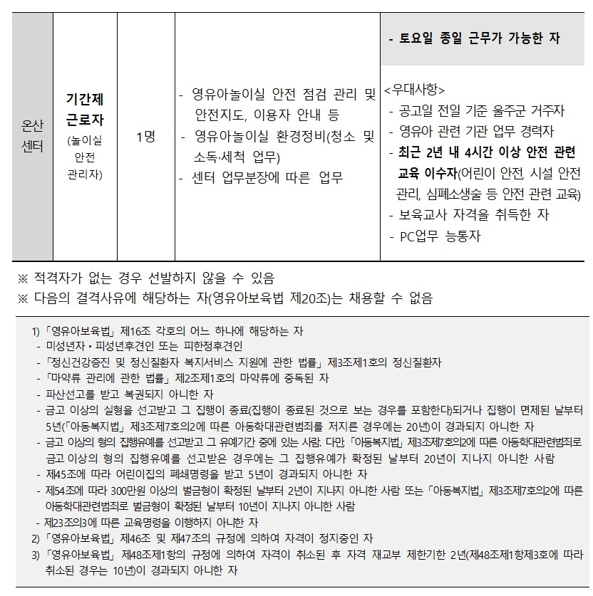 | [ä¿ë] º» ¼¾ÅÍ ±â°£Á¦ ±Ù·ÎÀÚ(º¸À°Àü¹®¿ä¿ø, ¿µÀ¯¾Æ³îÀÌ½Ç Áö¿øÀηÂ, ³îÀÌ½Ç ¾ÈÀü °ü¸®ÀÚ) ä¿ë °ø°í | |||||