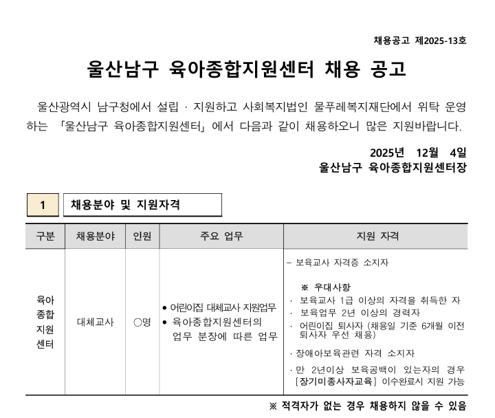 | [ä¿ë] ¿ï»ê ³²±¸À°¾ÆÁ¾ÇÕÁö¿ø¼¾ÅÍ ´ëü±³»ç ä¿ë °ø°í | |||||