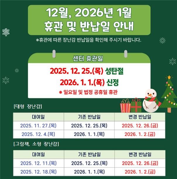 | [¿î¿µ] 12¿ù, 2026³â 1¿ù ¼¾ÅÍ ÈÞ°ü ¹× ¹Ý³³ÀÏ ¾È³» | |||||