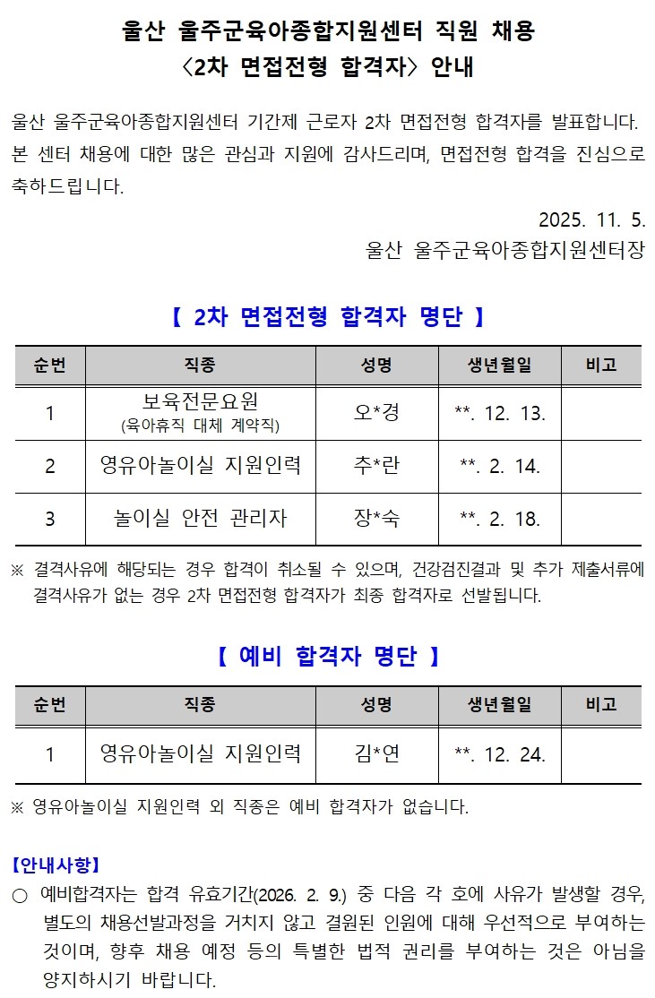| [ä¿ë] º» ¼¾ÅÍ ±â°£Á¦ ±Ù·ÎÀÚ(º¸À°Àü¹®¿ä¿ø, ¿µÀ¯¾Æ³îÀÌ½Ç Áö¿øÀηÂ, ³îÀÌ½Ç ¾ÈÀü °ü¸®ÀÚ) ä¿ë [2Â÷ ¸éÁ¢ÀüÇü ÇÕ°ÝÀÚ] ¾È³» | |||||