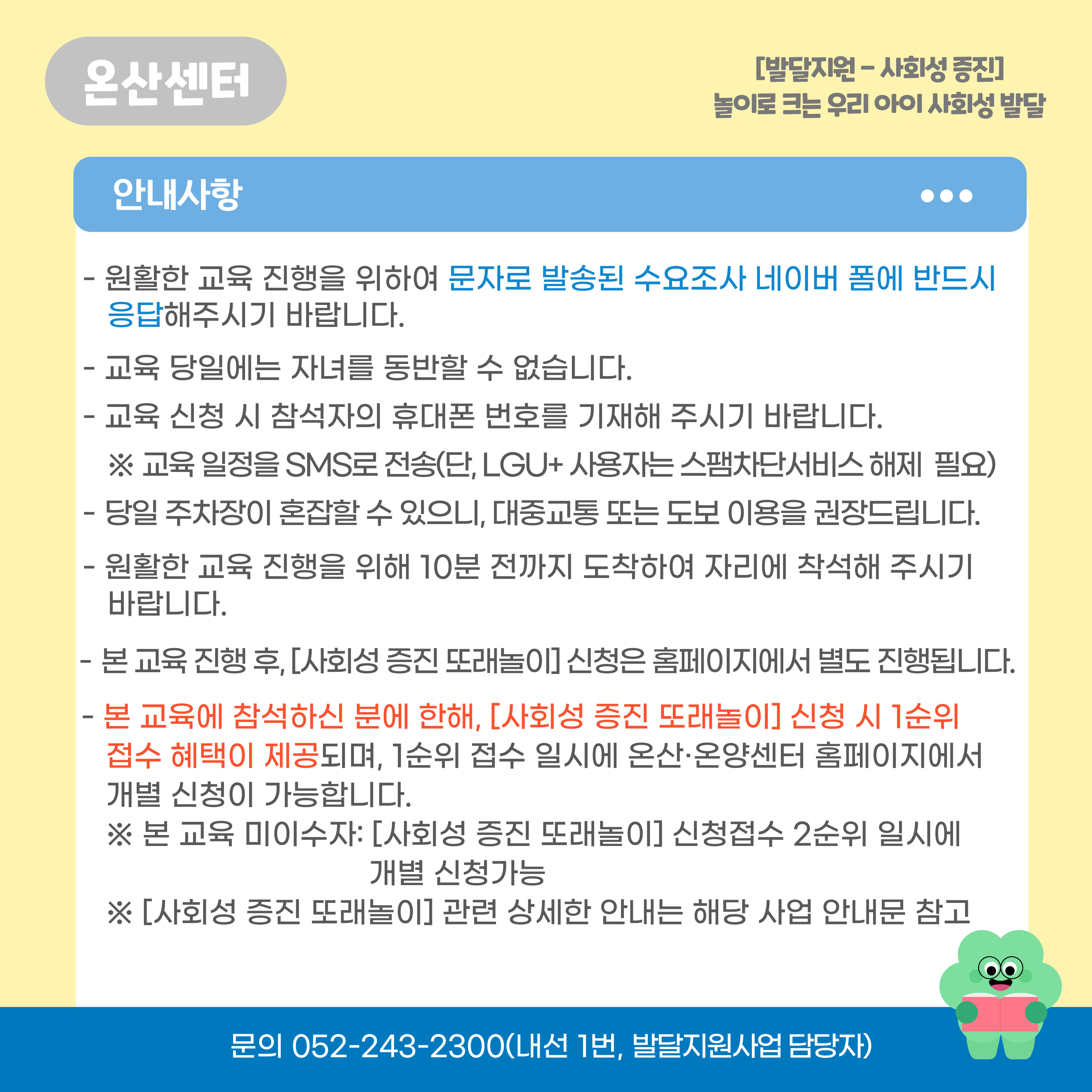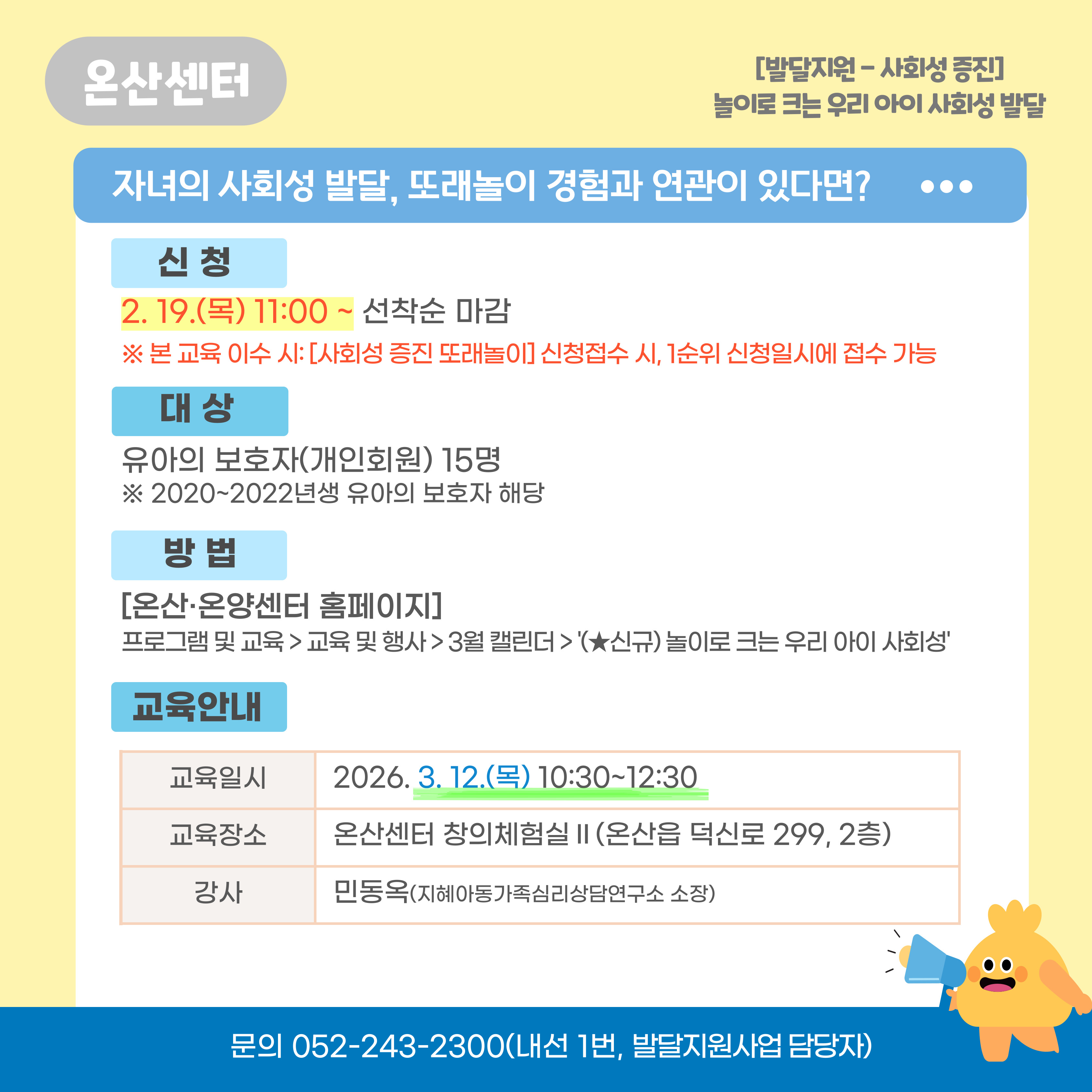 | ´ÙÀ½±Û | [¹ß´ÞÁö¿ø-»çȸ¼º ÁõÁø] (¡Ú½Å±Ô) »çȸ¼º ÁõÁø ¶Ç·¡³îÀÌ(20, 21³â»ý À¯¾Æ ´ë»ó) | ||||