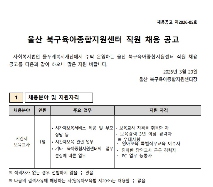 | ´ÙÀ½±Û | [ä¿ë] ¿ï»ê Áß±¸À°¾ÆÁ¾ÇÕÁö¿ø¼¾ÅÍ Á÷¿ø(½Ã°£Á¦º¸À°±³»ç) ä¿ë Àç°ø°í | ||||