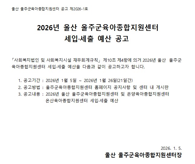 | 2026³âµµ ¿ï»ê ¿ïÁÖ±ºÀ°¾ÆÁ¾ÇÕÁö¿ø¼¾ÅÍ ¼¼ÀÔ¼¼Ãâ ¿¹»ê °ø°í | |||||
