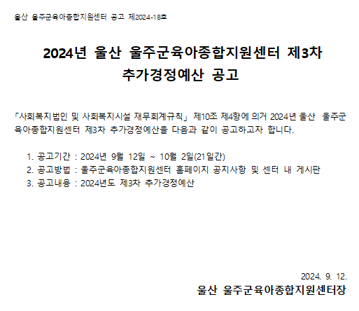 | 2024³â ¿ï»ê ¿ïÁÖ±ºÀ°¾ÆÁ¾ÇÕÁö¿ø¼¾ÅÍ Á¦3Â÷ Ãß°¡°æÁ¤¿¹»ê °ø°í | |||||