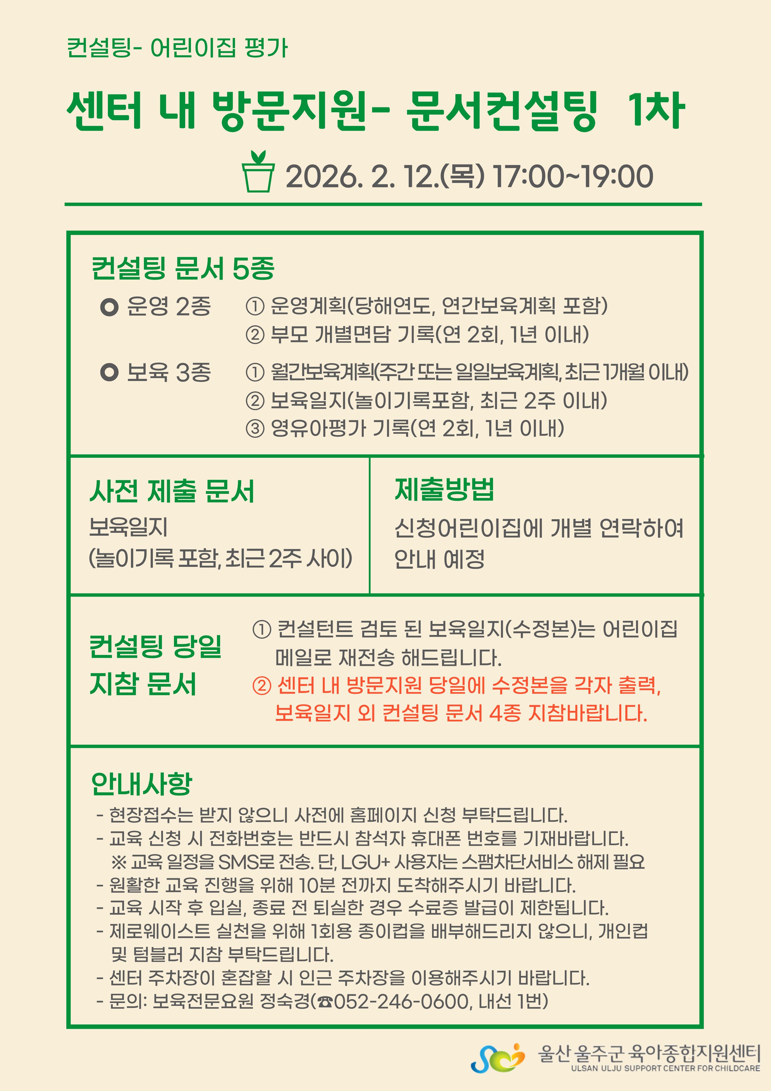 | [ÄÁ¼³ÆÃ] [¾î¸°ÀÌÁý Æò°¡] ¼¾ÅÍ ³» ¹æ¹®Áö¿ø 1Â÷(¹®¼ÄÁ¼³ÆÃ) | |||