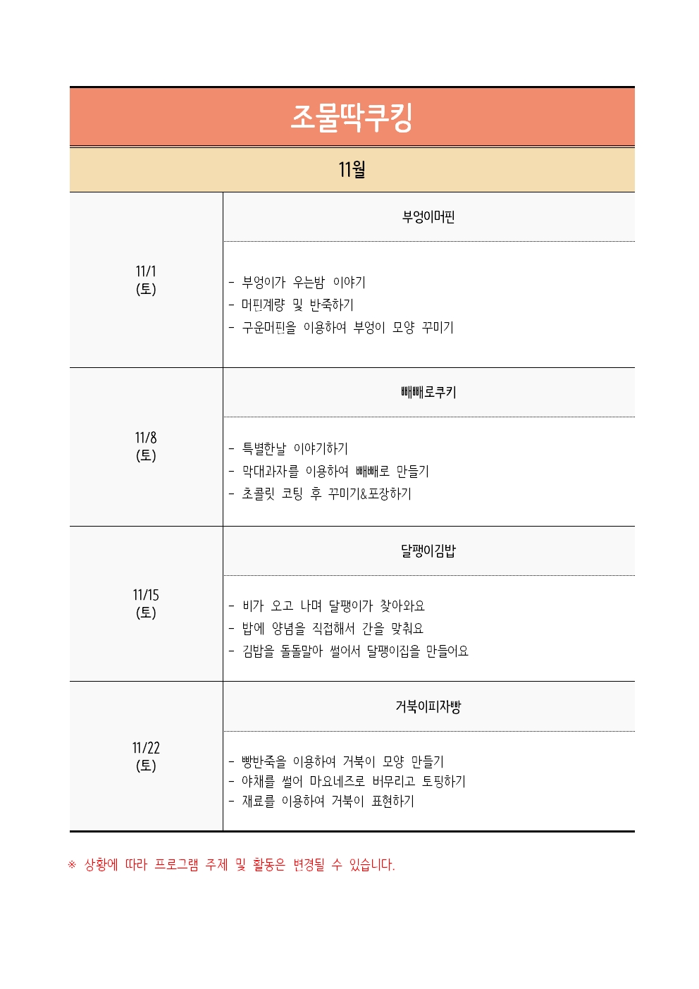 | ±³À°Àå¼Ò | ¿ïÁÖ±º¼¾ÅÍ 2Ãþ ¿ä¸®Ã¼Çè½Ç | ±³À°´ë»ó | 2019-01-01~2020-12-31 |