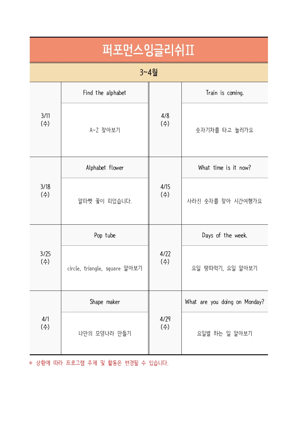 | ±³À°ÀϽà | 2026-03-11(¼ö) , 2026-03-18(¼ö) , 2026-03-25(¼ö) , 2026-04-01(¼ö) 2026-04-08(¼ö) , 2026-04-15(¼ö) , 2026-04-22(¼ö) , 2026-04-29(¼ö) |