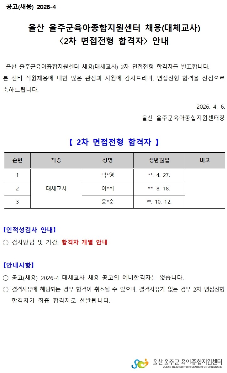 | ´ÙÀ½±Û | [ä¿ë] º» ¼¾ÅÍ Á÷¿ø(½Ã°£Á¦º¸À°±³»ç, »ç¾÷Áö¿øÀηÂ) ä¿ë [2Â÷ ¸éÁ¢ÀüÇü °á°ú] ¾È³» | ||||