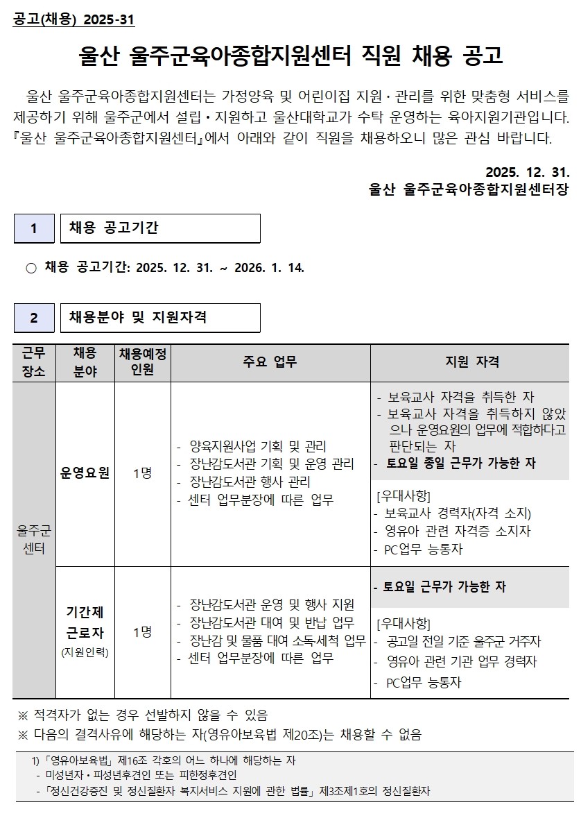 | ÀÌÀü±Û | [ä¿ë] º» ¼¾ÅÍ ±â°£Á¦ ±Ù·ÎÀÚ(»ó´ãÀü¹®¿ä¿ø, º¸À°Àü¹®¿ä¿ø) ä¿ë °ø°í | ||||