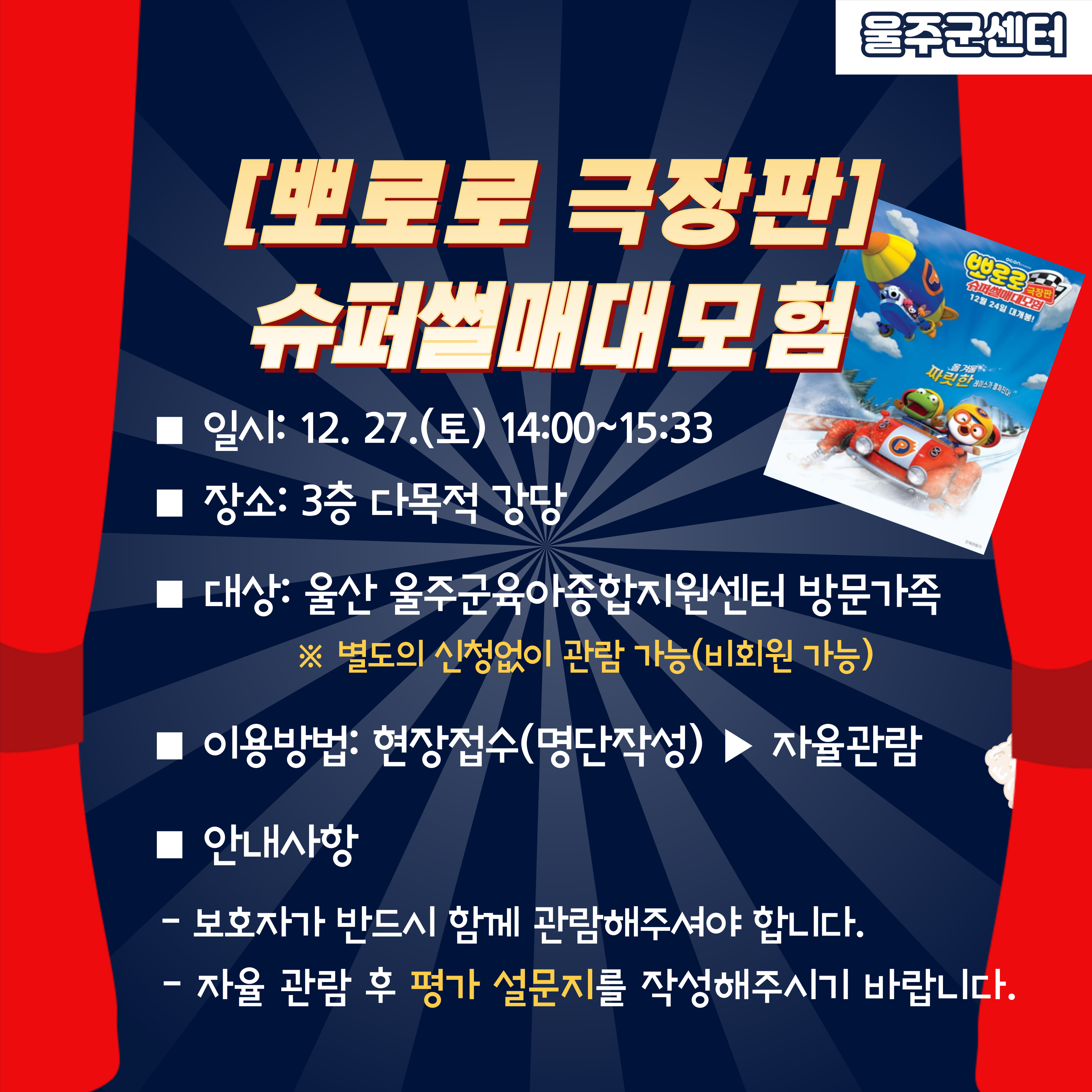 | <¹®È³îÀÌÁö¿ø> 12¿ù ¿µÈ°ü¶÷ '»Ç·Î·Î ½´ÆÛ½ä¸Å ´ë¸ðÇè' | |||||