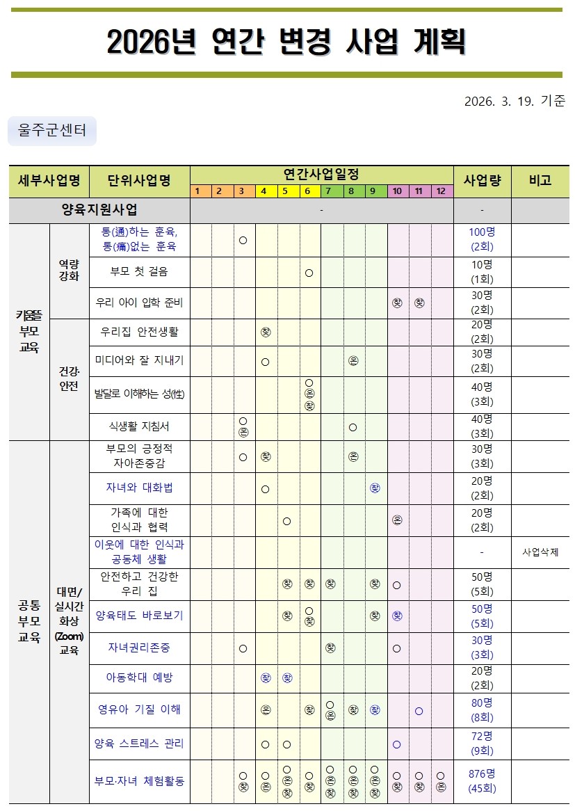 | 2026³â ¿ïÁÖ±ºÀ°¾ÆÁ¾ÇÕÁö¿ø¼¾ÅÍ ¿¬°£ º¯°æ »ç¾÷ °èȹ | |||||