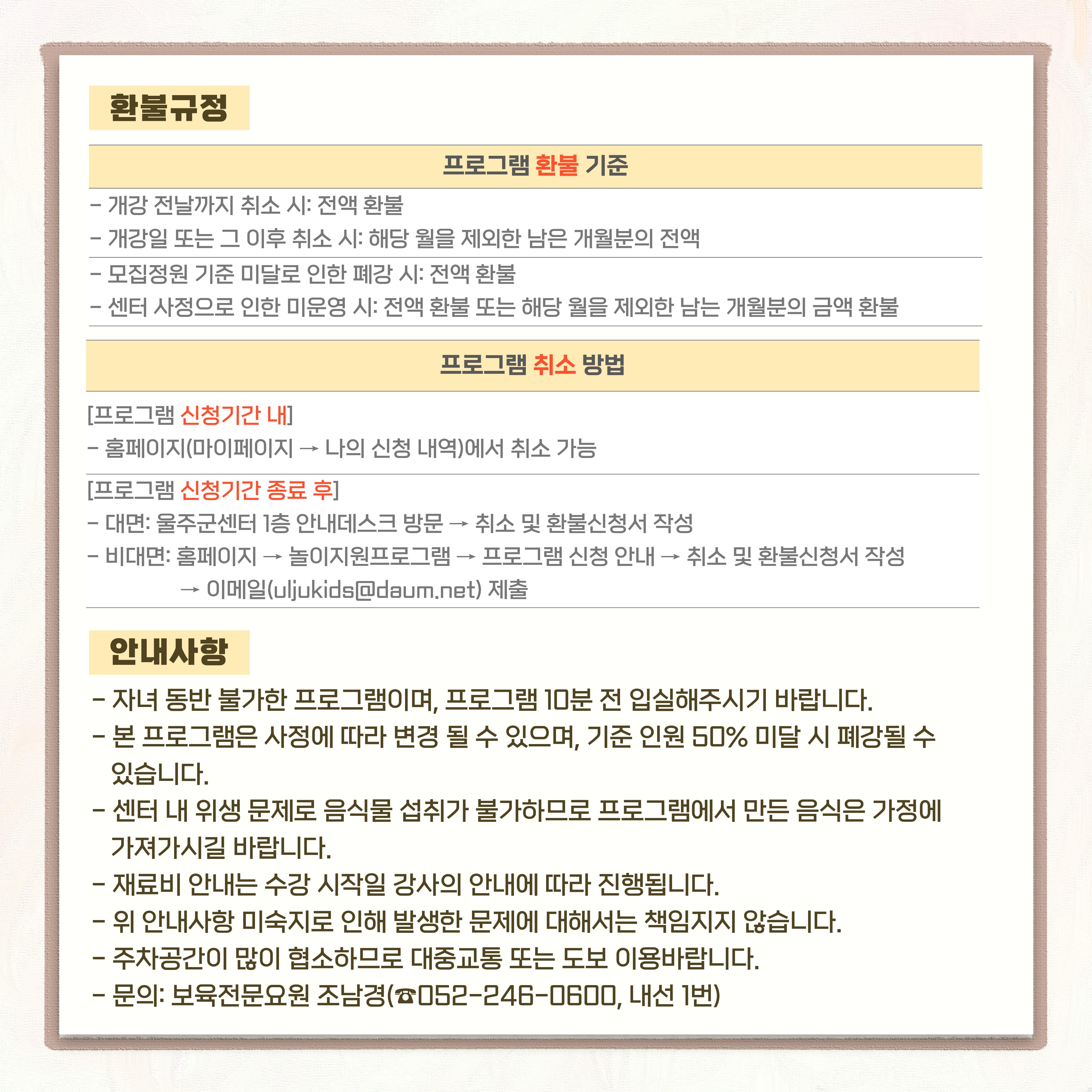 | ±³À°Àå¼Ò | ¿ïÁÖ±º¼¾ÅÍ 2Ãþ ¿ä¸®Ã¼Çè½Ç | ±³À°´ë»ó | 2020-01-01~2026-07-31 |