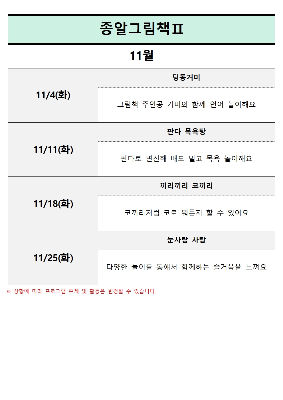 | ±³À°ÀϽà | 2025-11-04(È) , 2025-11-11(È) , 2025-11-18(È) , 2025-11-25(È) | ||