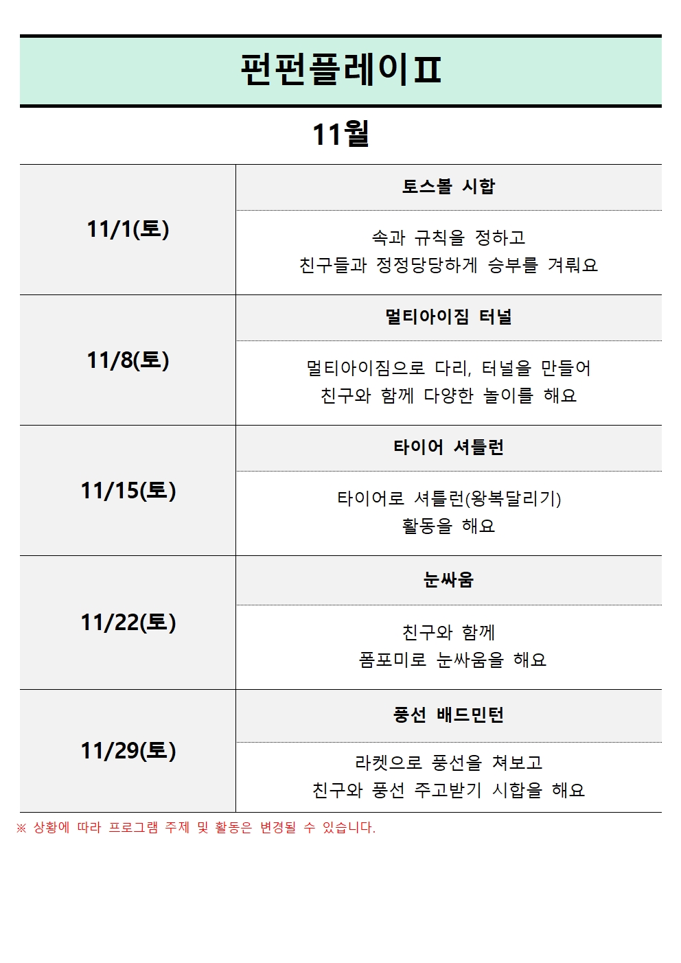 | [¿Â»ê¼¾ÅÍ] [11¿ù] ÆÝÆÝÇ÷¹ÀÌ¥± (2019~2020³â»ý) 14:30~ | |||